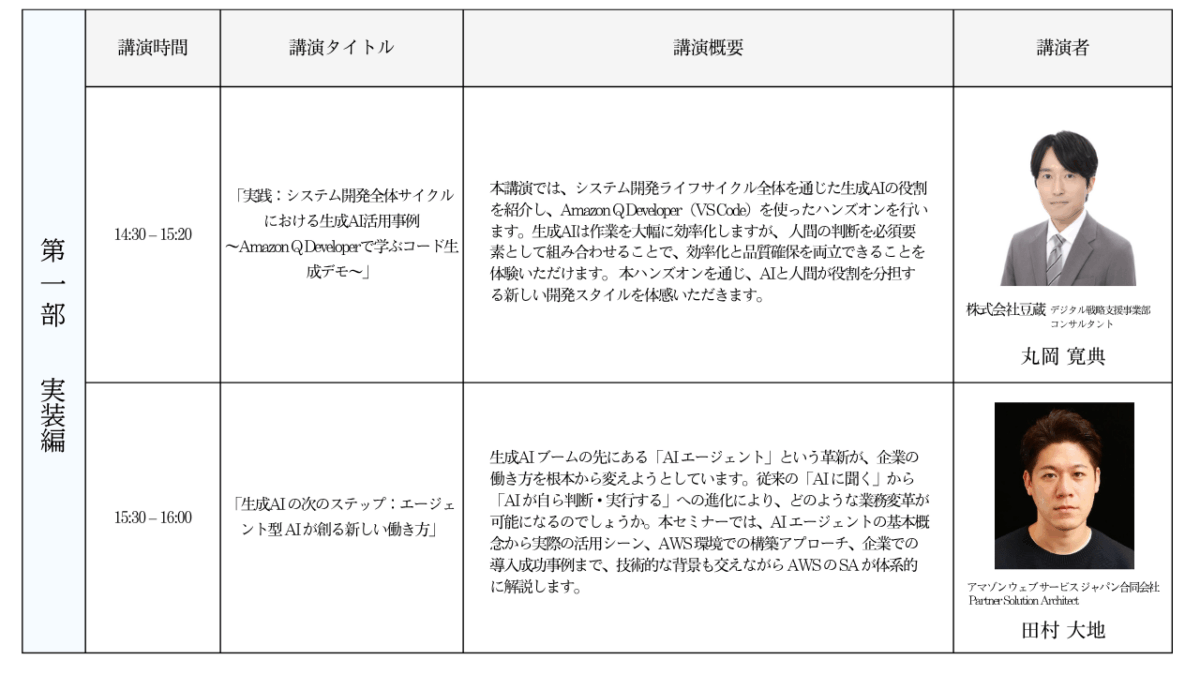 AI時代には、システム開発工程においても、AI/生成AI技術を使って、人とAIの役割を見直しした未来のシステム開発が求められます。本セミナーでは、生成AIがもたらすシステム開発の変革に焦点を当て、その具体的な活用法と効率化の秘訣を深掘りします。生成AI時代の開発プロセスや組織変革、さらに要求整理から開発工程における実践的なAI活用事例や実際の効果を紹介し、最新のAWS生成AIテクノロジーを活用したシステム開発効率化をデモの実演と再現体験の両方を通じて実感いただける機会をお届けします。生成AIをシステム開発にどう取り入れ、生産性を飛躍的に向上させるか、その「今」と「これから」を知る絶好の機会です。