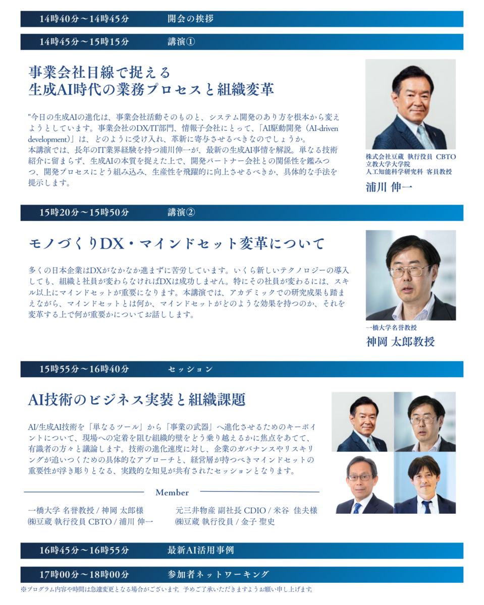 本セミナーでは、DX、AIを推進する上で重要な組織変革を実践してきた大企業のCIO、CDOの方々からAI時代に必要な推進の手順についてを解説します。異業種でもDX・AI推進の組織変革の本質・エッセンスは製造業にも活用できるポイントが多くあります。また本セミナーでは、「属人的なAI利用の限界」を超え、生成AIを製造業の全社戦略として機能させるための実践的な解決方針を、豆蔵がこれまで支援してきた製造業の具体的なDX事例を基にご紹介します。