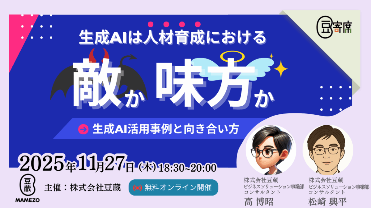 - 豆蔵技術イベント!第47回豆寄席11月27日(木)開催!生成AIは人材育成における敵か味方か 生成AI活用事例と向き合い方(高 博昭・松崎 興平 / 株式会社豆蔵 ビジネスソリューション事業部 コンサルタント)
